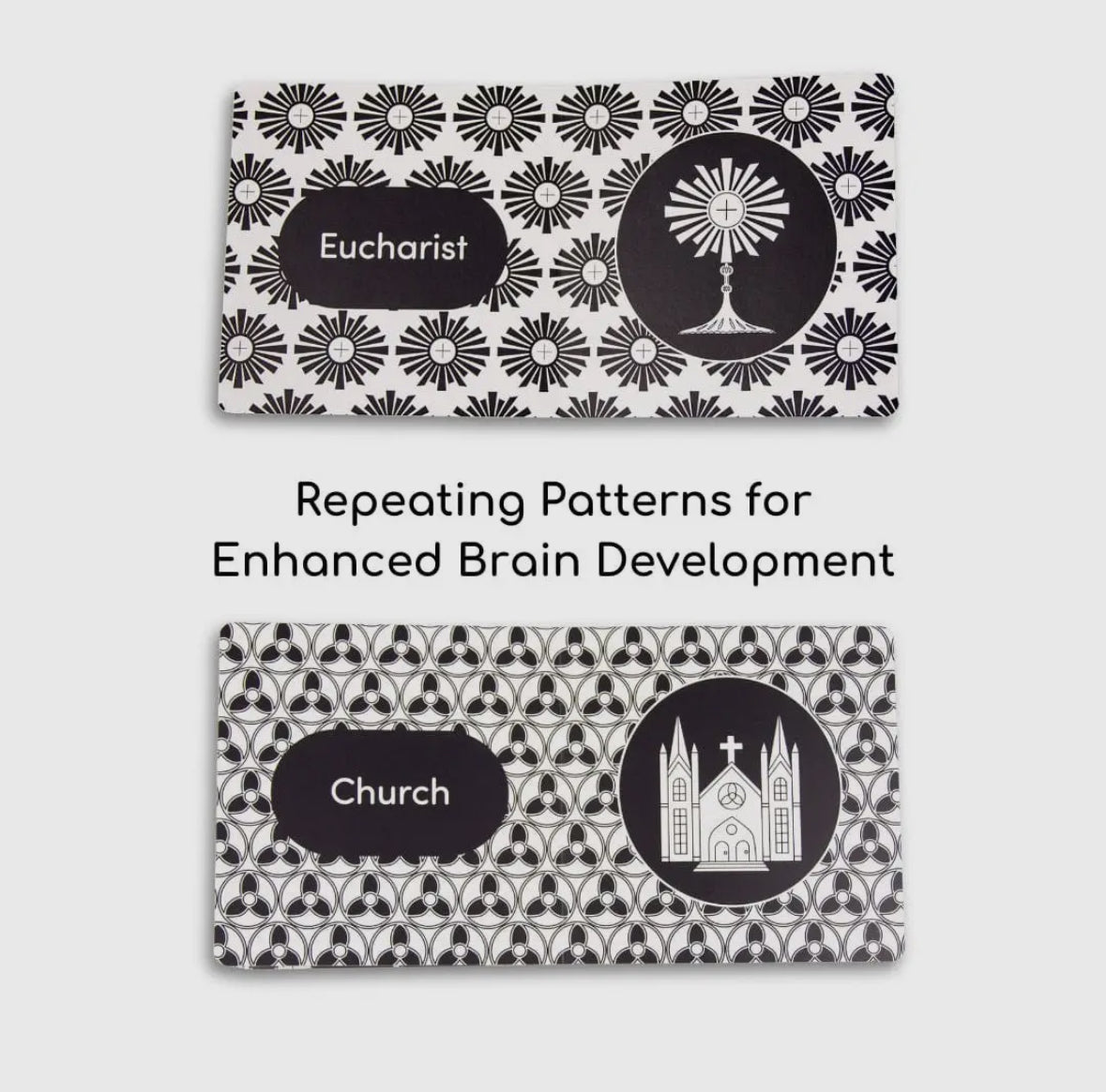 Introducing Baby’s 1st Catholic Book: A High Contrast Book — a specially designed board book that stimulates your baby’s developing vision and mind while introducing them to the beauty of the Catholic faith.
