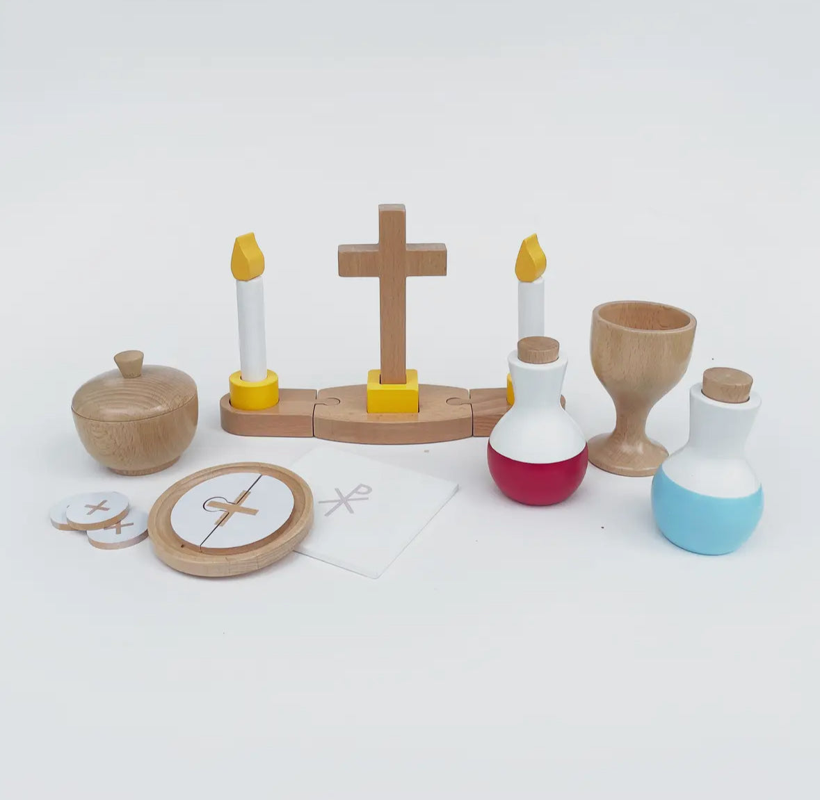 Includes a buildable altar with cross and candles, wine cruet, holy water cruet, chalice, chalice pall, paten with priest host, and ciborium with 6 hosts—each item designed to reflect the sacred vessels used during Mass. Made from solid wood. 28 pieces in total.