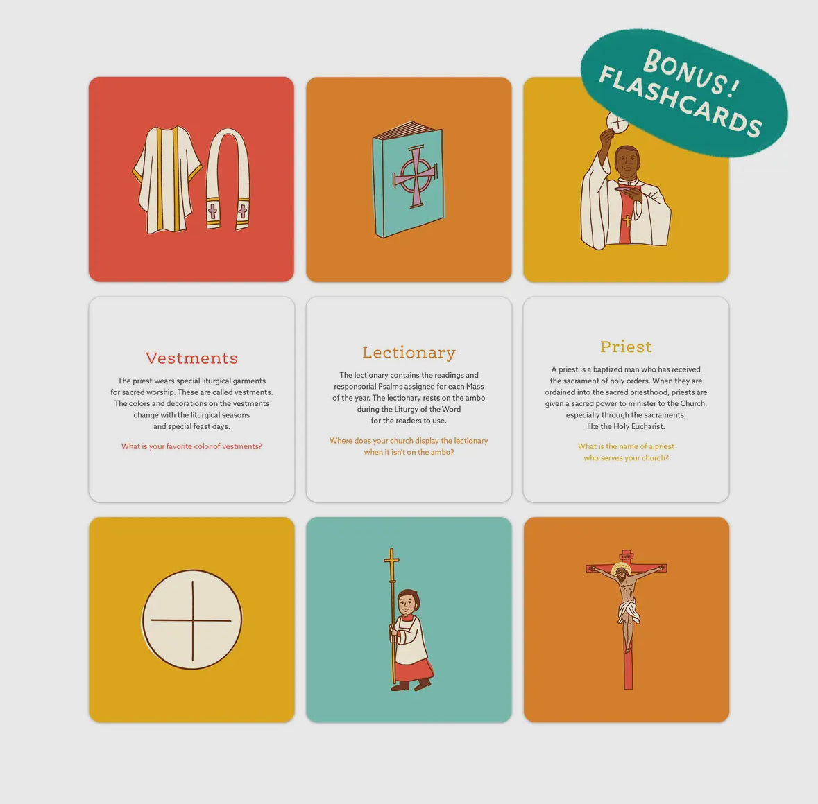 - Symbols: Tabernacle, Altar, Thurible, Cruets, Ambo, Paschal Candle, Ciborium, Lectionary, Chalice, Host, Altar Server, Crucifix, Vestments, and Priest Bonus! The deck includes one flashcard for each image to learn more about the items you see at Mass.
