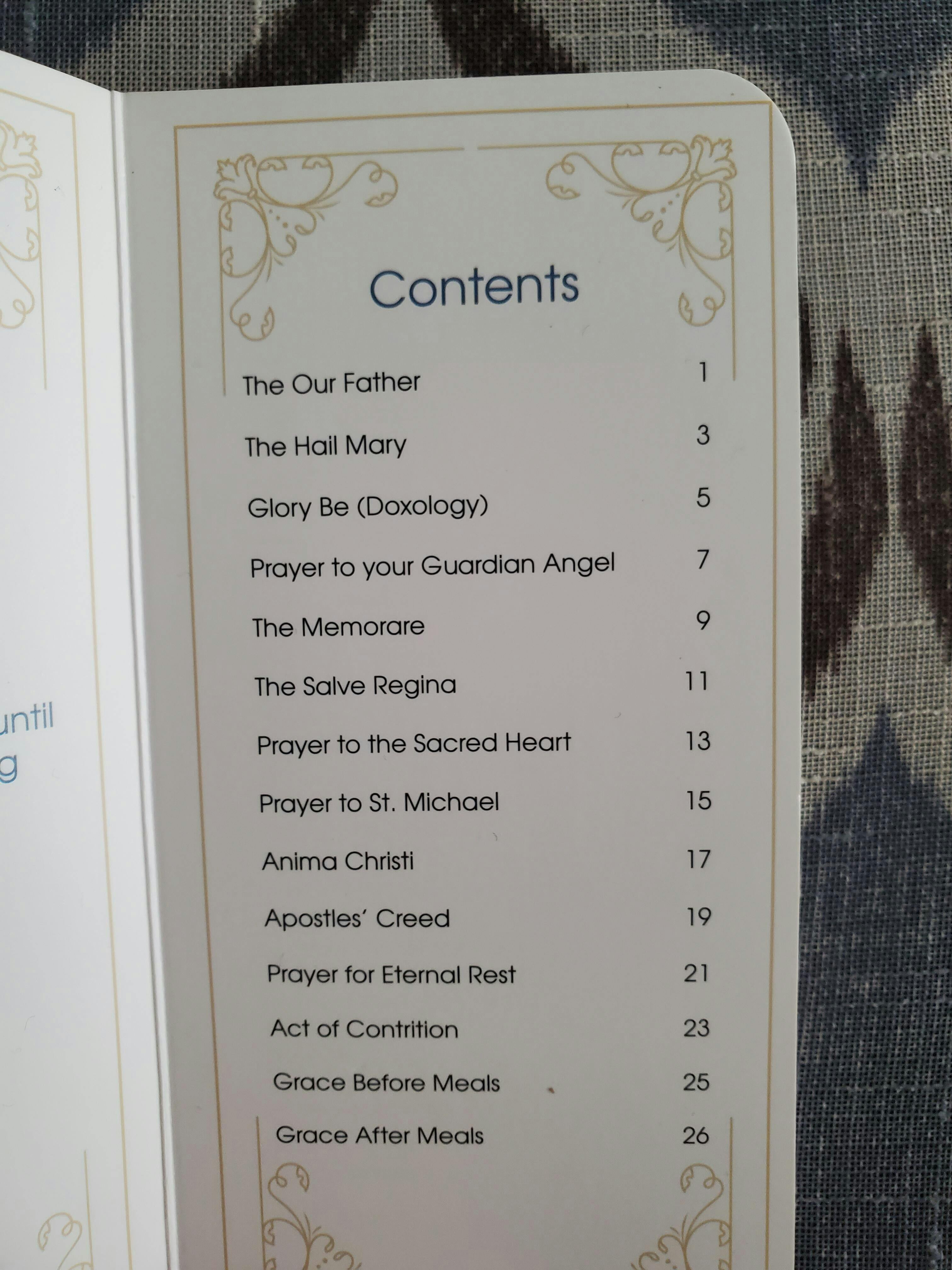 Our Father, Hail Mary, Glory Be (Doxology), Prayer to Your Guardian Angel, The Memorare, Salve Regina (Hail Holy Queen), Prayer to St. Michael the Archangel, Anima Christi, Apostles' Creed, Prayer for Eternal Rest, Act of Contrition, Grace Before Meals, Grace After Meals